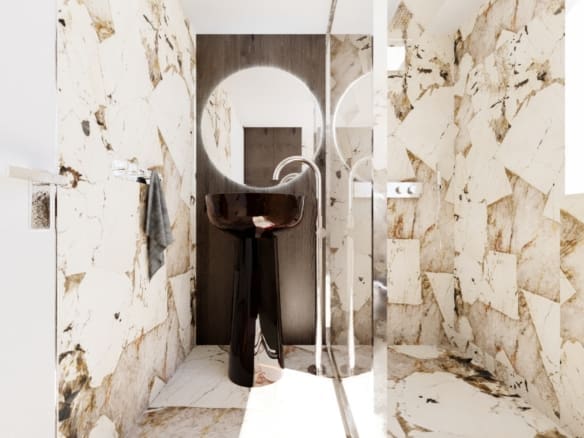 This 136 sq.m. first-floor apartment is part of a contemporary building defined by its unique architectural character, offering both visual appeal and exceptional living comfort.